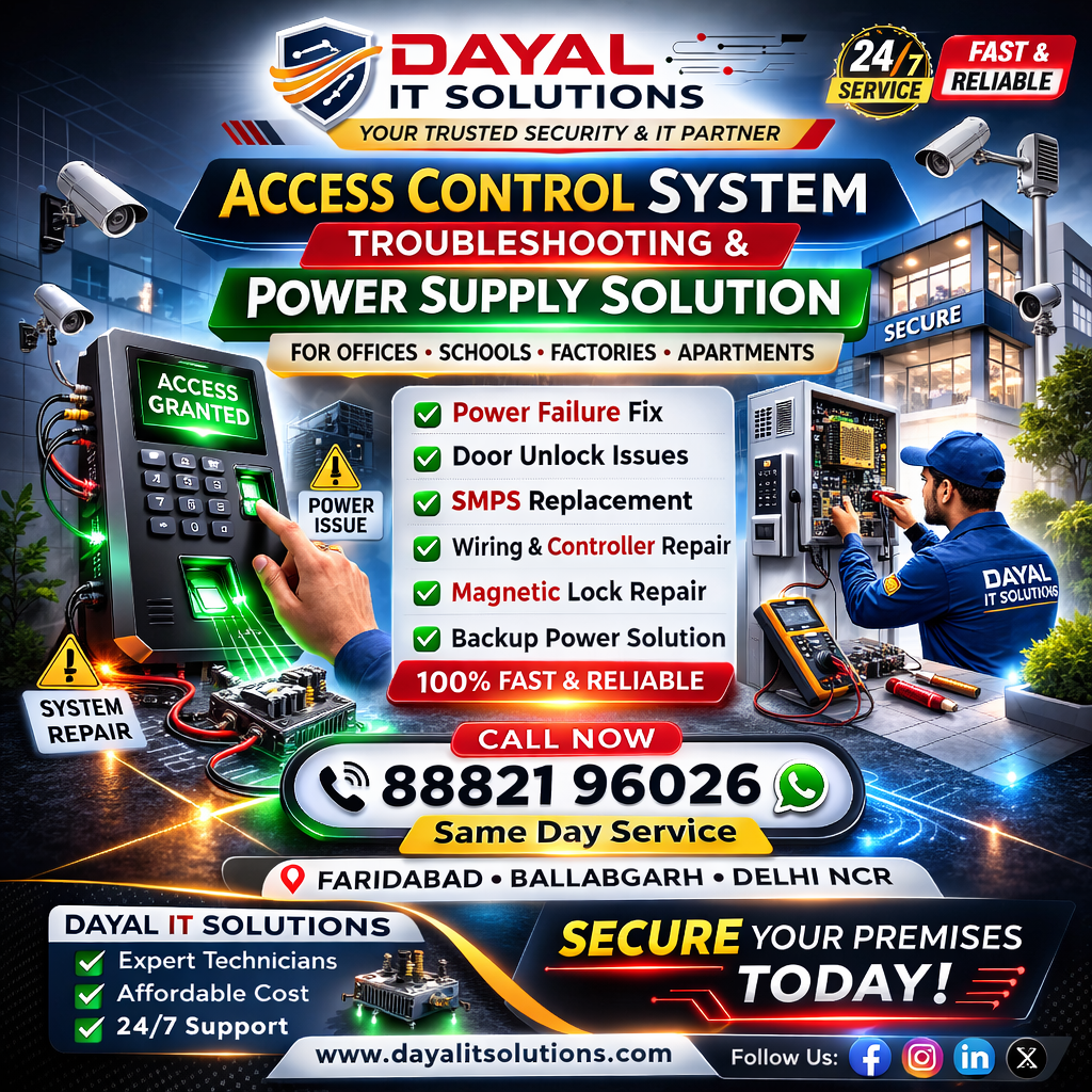 DAYAL IT SOLUTIONS provides fast and professional Access Control System troubleshooting and repair services in Faridabad, Ballabgarh, and Delhi NCR. Our expert technicians quickly diagnose and resolve power-related issues to restore your system safely and efficiently.